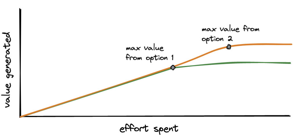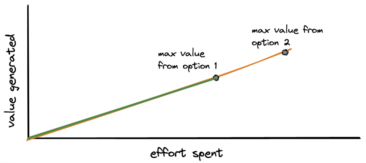 I am not using the mathematical definition of the term. For the purpose of this discussion, let’s have two functions of effort spent vs value generated.