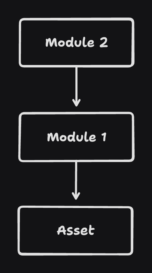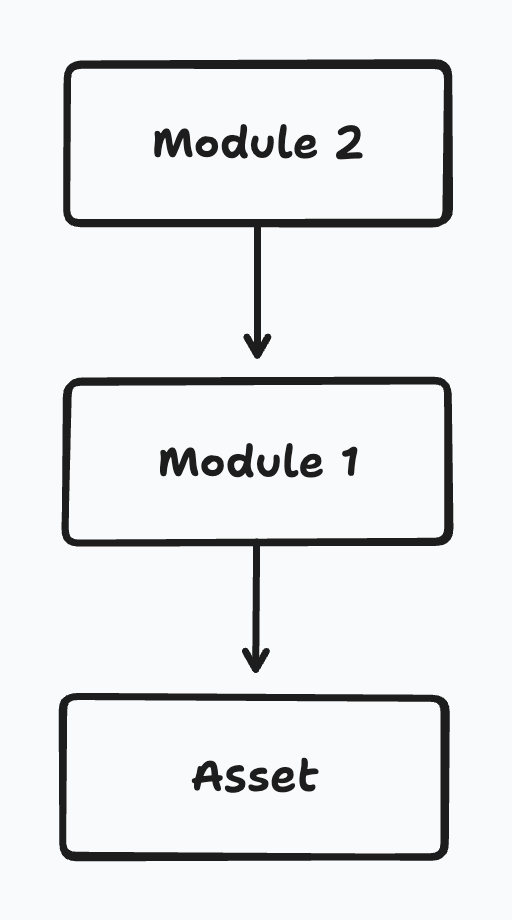 So, let’s consider the following file dependency structure: Module 1 imports Asset, and Module 2 imports Module 1